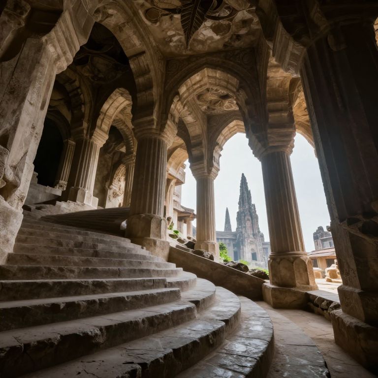 Spiraling stone steps ascend through an ancient, cavernous structure, winding between towering columns and arches, illuminated by ethereal light filtering through distant openings that reveal jagged spires piercing the horizon.