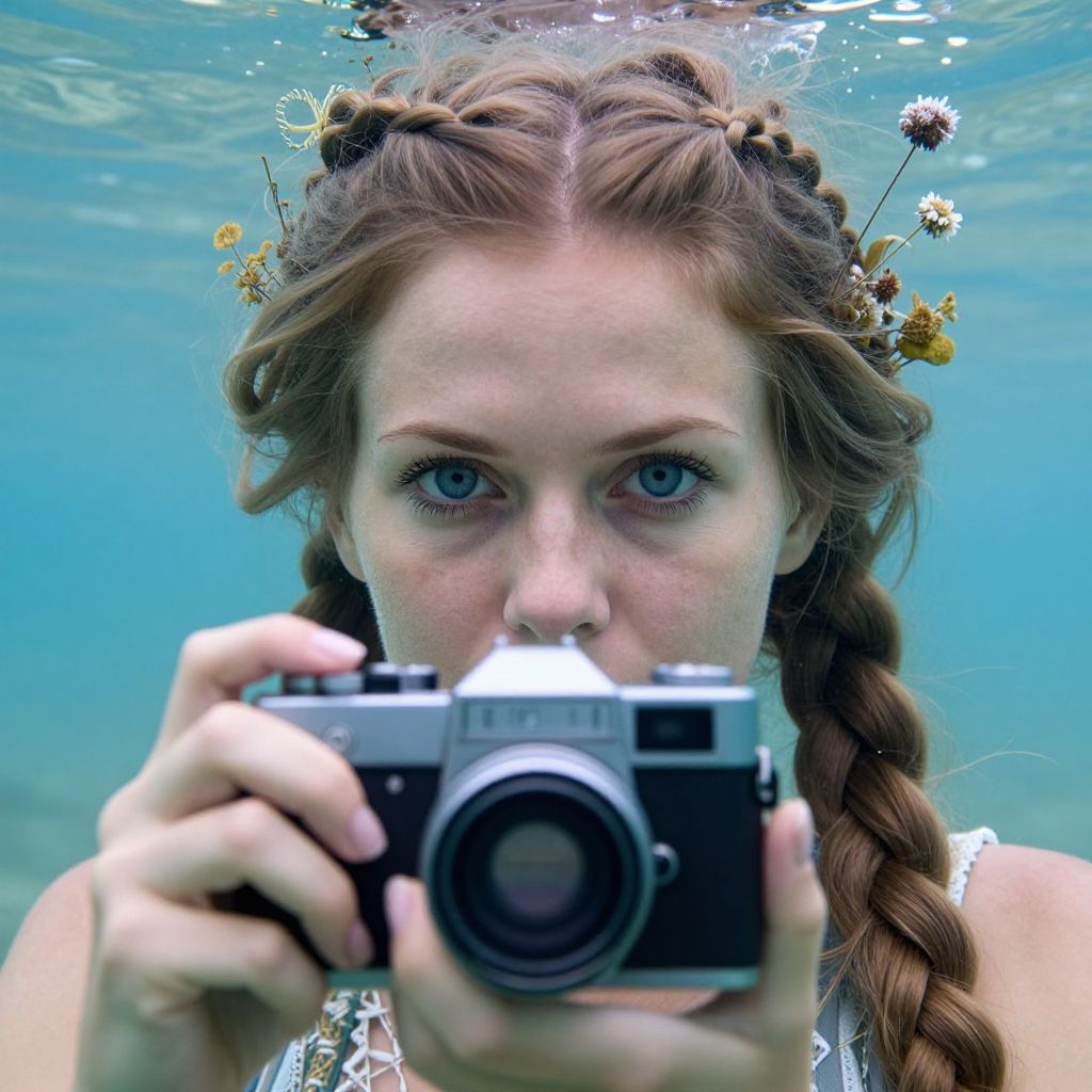 Photograph of a fair-skinned, blue-eyed woman with long, auburn hair braided and adorned with small, yellow and white daisies, underwater. She holds a vintage black and silver camera close to her face, taking a picture. Her gaze is direct and focused. The clear, blue water creates a serene backdrop, with light reflecting off her hair and face. The image has a slightly surreal, ethereal quality due to the underwater setting and natural light. The camera lens is centered in the foreground, while her face and hair are in sharp focus.