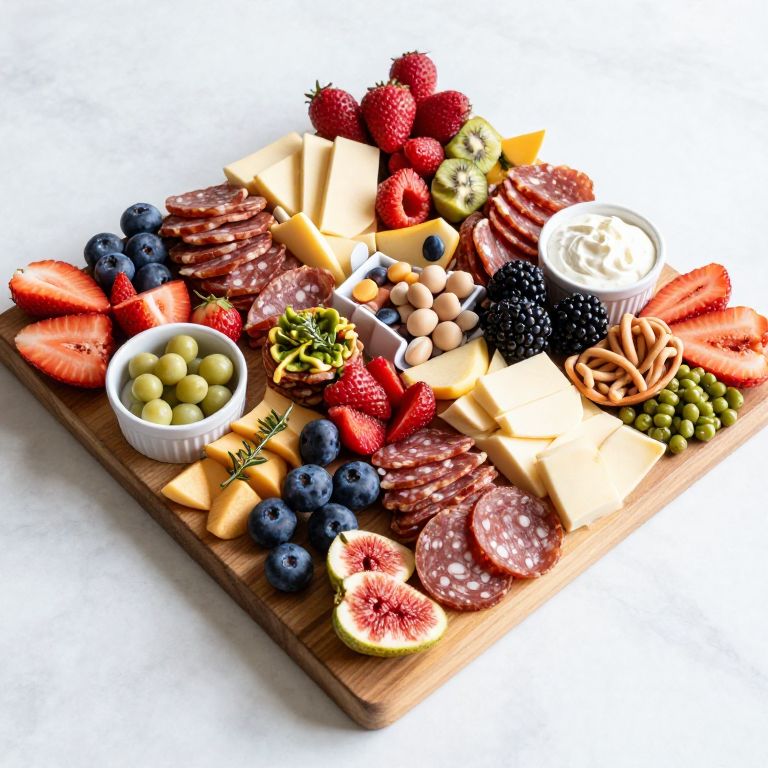 A vibrant photograph of a wooden platter filled with an assortment of gourmet foods. Items include sliced strawberries, blueberries, figs, salami, cheese cubes, green olives, almonds, walnuts, and a small white ramekin of creamy dip. The colors are bright and varied, with reds, blues, greens, and browns. The platter is arranged in a visually appealing, slightly circular pattern on a white surface. The textures range from the smooth cream to the crisp salami slices and juicy fruits. The image is brightly lit, highlighting the freshness and detail of each food item.