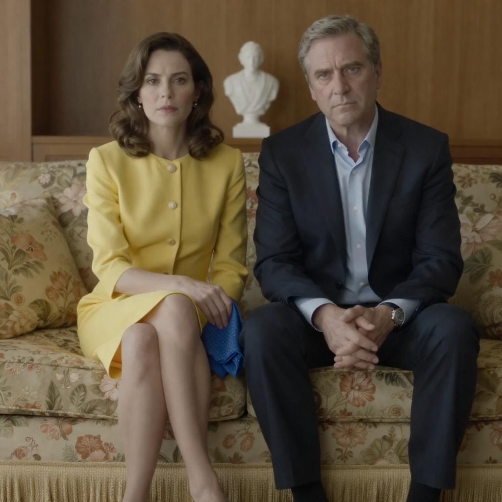 Photograph of Jack Rosenthal and Jacqueline Bisset sitting on a floral-patterned couch. Jack, in a dark suit, looks serious, while Jacqueline, in a bright yellow dress with a matching jacket, holds a blue handkerchief and gazes forward. Background includes a wooden wall and a small white sculpture.