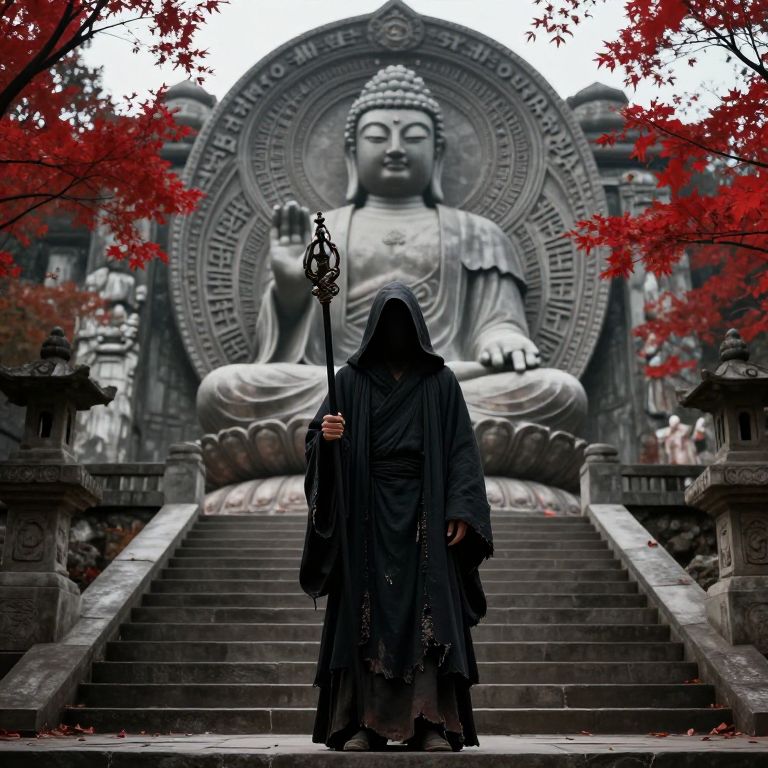 In this highly detailed and ultra-fantasy scene, a figure clad in dark, tattered robes stands in front of a grand, ancient structure, its stone steps leading up to a massive statue of Buddha Amitabha. The statue, towering above, is intricately carved with symbols and patterns, exuding an aura of mystique and reverence. The figure, shrouded in a hood, holds a staff in hand, suggesting a sense of authority or guardianship. Surrounding the scene are trees with autumnal leaves, their red hues contrasting with the muted tones of the stone and the figure's attire. The overall composition is balanced, with the figure and statue centrally positioned, creating a sense of harmony and reverence. The high definition and ultra-fantasy elements, combined with the high contrast and vibrant colors, enhance the immersive quality of the image, making it a captivating visual experience.