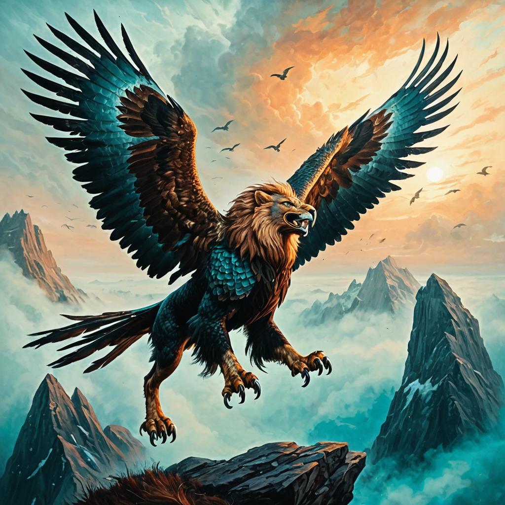 Oil painting of a majestic griffon with a lion's body and an eagle's head, depicted in teal and copper tones. The griffon is flying in a foggy dawn sky with rich, textured brushstrokes. Several smaller birds and a rocky cliff are visible in the misty background, creating a dramatic fantasy scene.