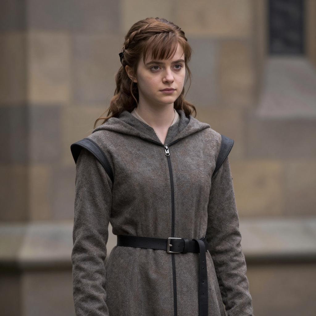 Toad costume girl, photorealistic, young woman, wearing frog hat with big eyes, green scarf, brown belt, beige and green medieval-style dress, brown leather gloves, standing in narrow alley, medieval European buildings, daytime, detailed ures, soft light, realistic clothing folds, neutral expression, backpack straps, T2I, highly detailed, realistic lighting, photorealistic style, fantasy character