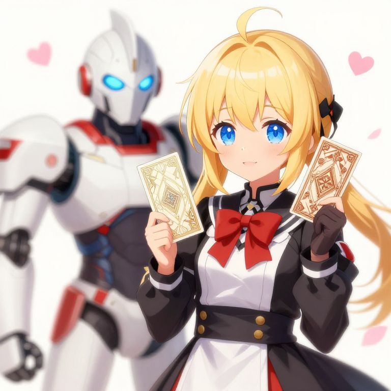 Digital illustration of an anime-style blonde girl with blue eyes wearing a black and white outfit with a red bow holding a decorative card alongside a humanoid robot with blue eyes, a white helmet, and red and white armor, both showing cards with intricate designs against a soft background with floating pink petals and heart icons.