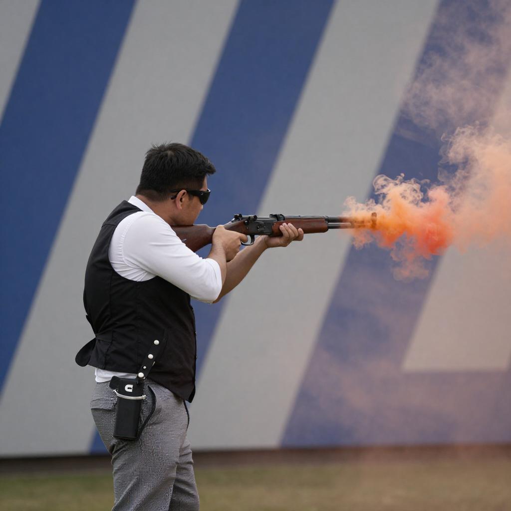 Man Aiming Rifle at Smoking Plant