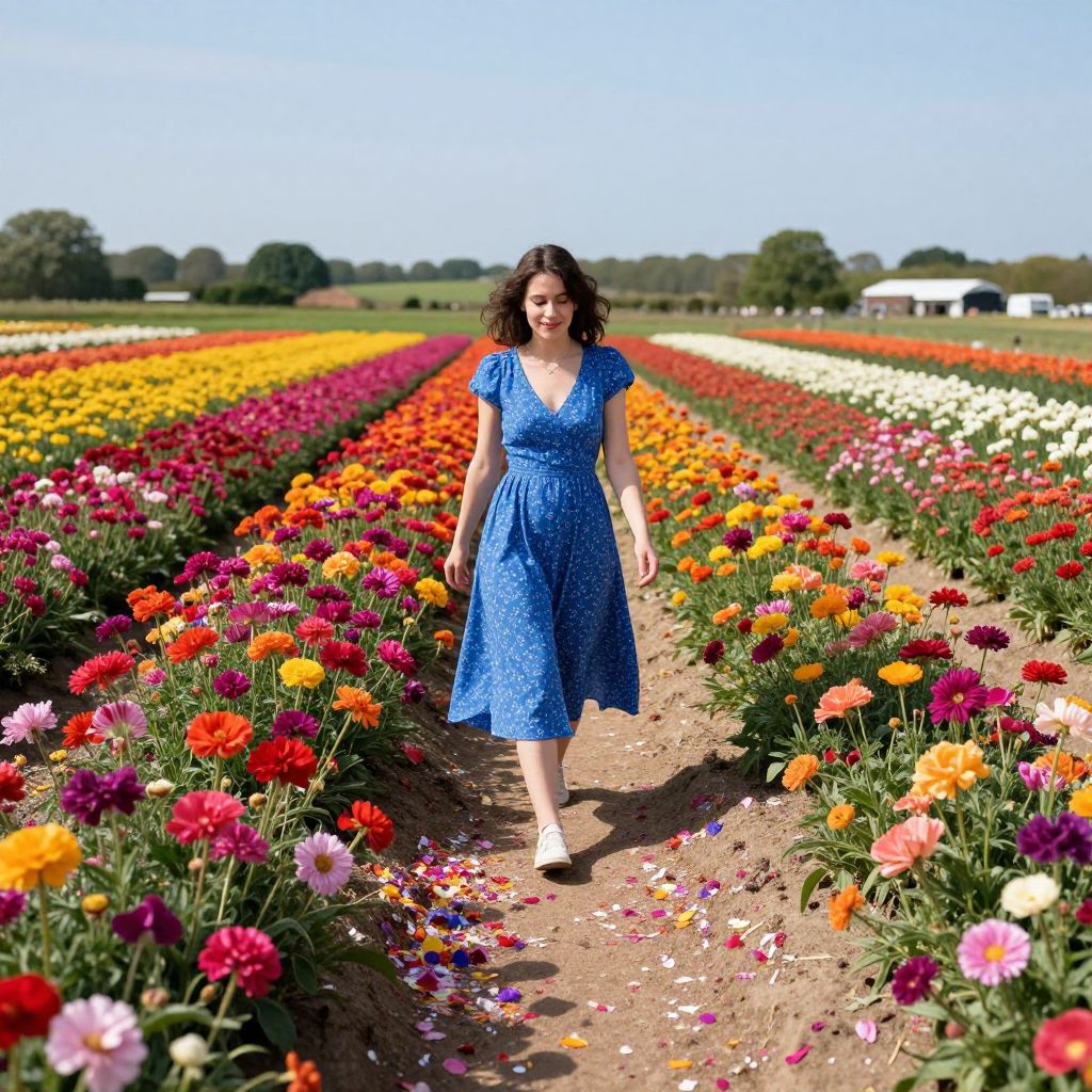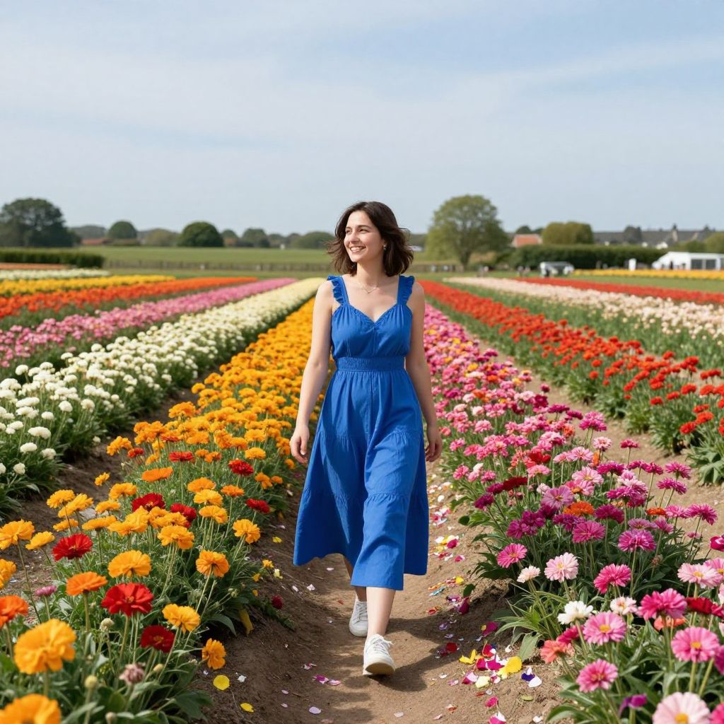 Woman strolling through vibrant rows of colorful flowers at the Real Flower Petal Confetti Co Flower Fields in Warwick, outside of London, wearing a flowing blue dress and smiling under a clear sky.