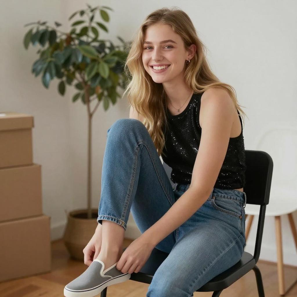 Photograph of a smiling young woman with long blonde hair, wearing a black sequined top and blue jeans, sitting on a black chair. She is adjusting her gray slip-on shoe with her right hand. Background includes a leafy plant, stacked cardboard boxes, and a white chair.