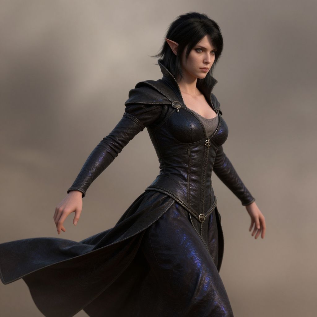 Female elven Rogue Moving, Muscular, Round Face, pale Skin, (deep black Hair:1.5), grey Eyes, Narrow Nose, Thin Lips, Sharp Chin, Ducktail, Shortplain dressnatural, shimmering, vibrant, gothic, rpg, 1400ad, ultra detailed, detailed, immersive, reminiscent of high fantasy RPG games, HD, masterpiece, best quality, hyper detailed, super realistic, perfect face, perfect hands, award-winning, professional, breathtaking, linquiveracloudy Prairiedusty weatherprofessional 3d model . octane render, highly detailed, volumetric