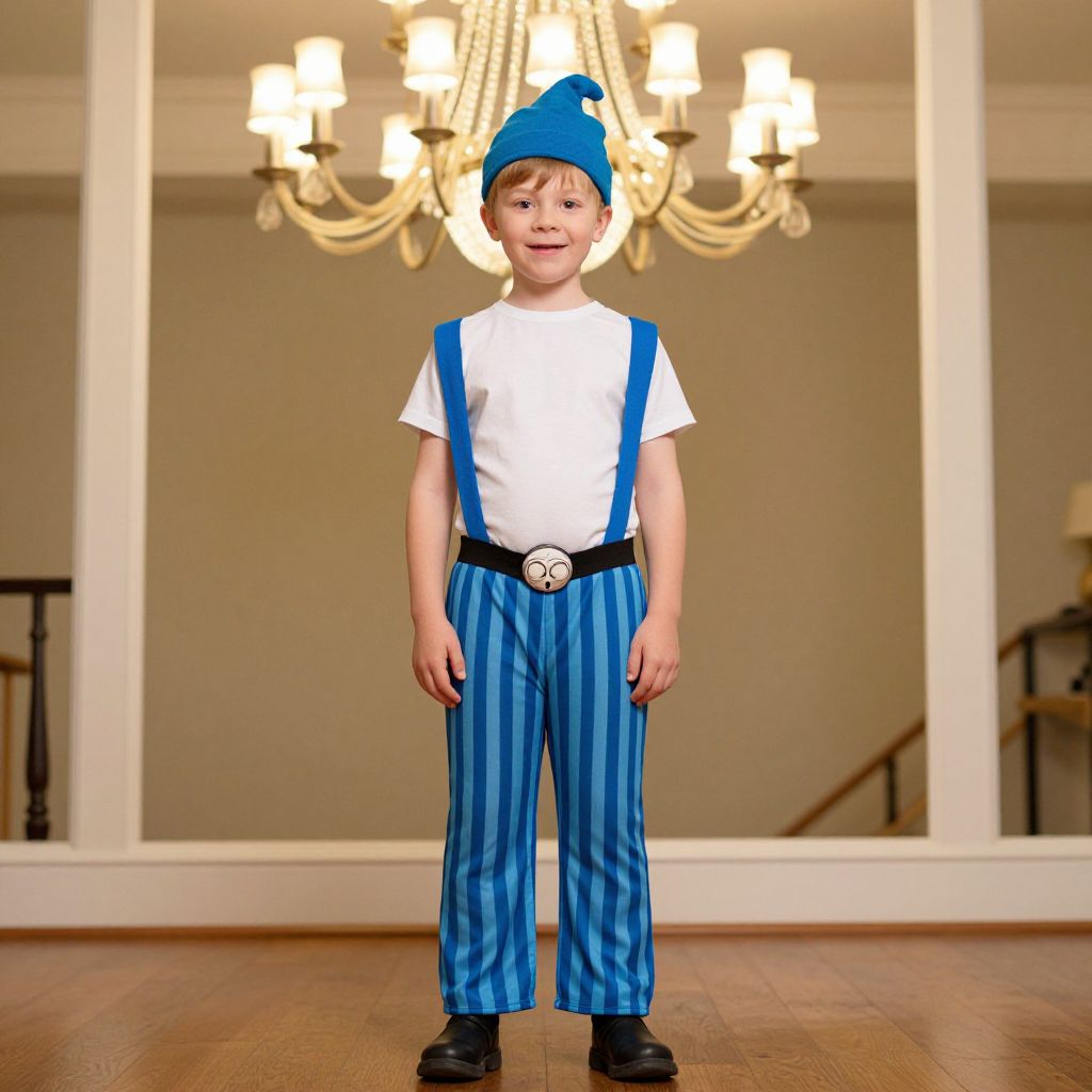 Captain Underpants Costume Boy, boy in a blue hat and striped pants stands in front of a chandelier