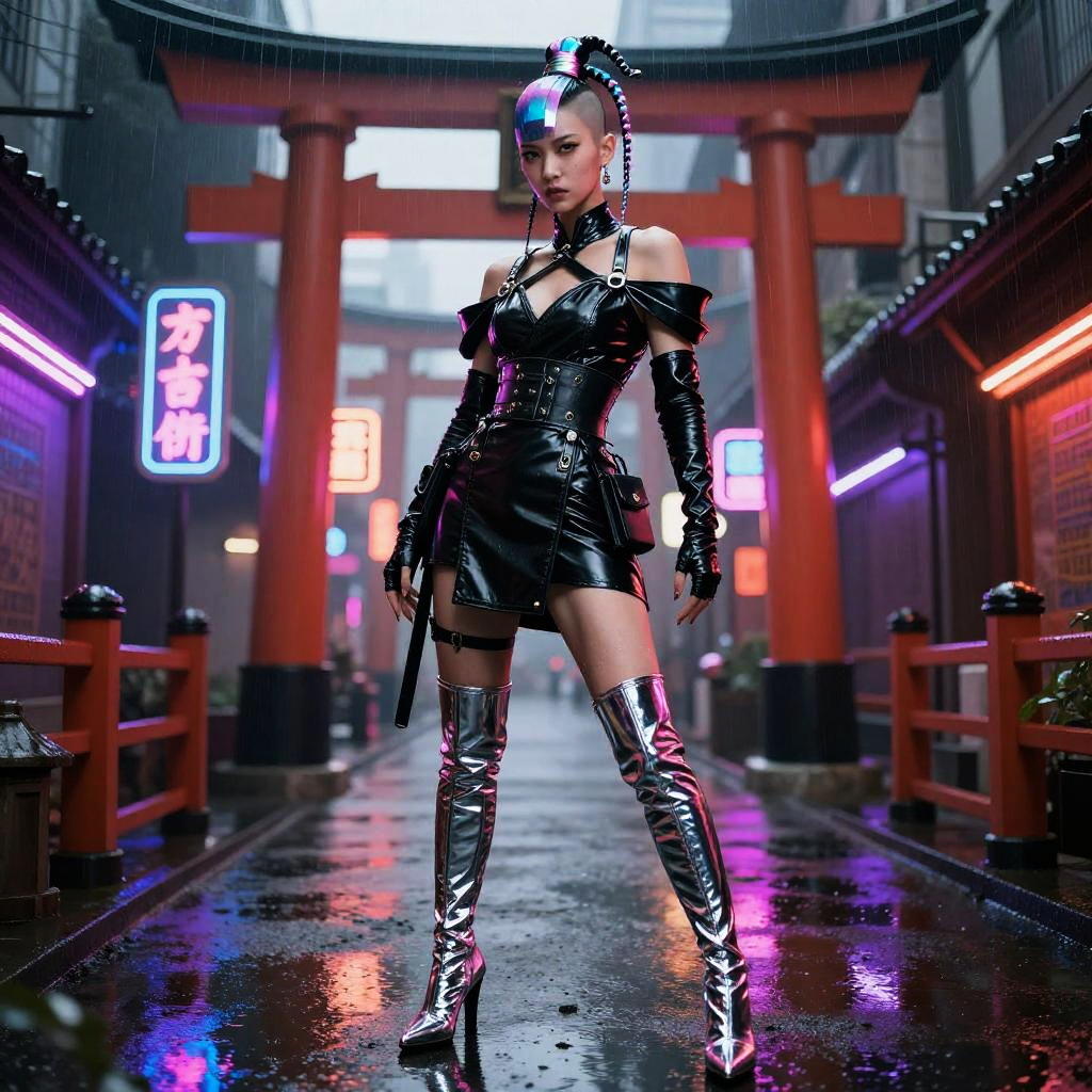 Androgynous cyber-samurai standing confidently in a rain-soaked neon-lit alley with a traditional torii gate. The subject wears an off-shoulder onyx lacquered leather kimono dress with matte-latex samurai harness, chrome-plated thigh-high latex boots, utility obi, and fingerless gauntlets. Hair styled in a half-shaved iridescent topknot with micro-braids. The setting features holographic neon signage and reflective wet pavement emphasizing a futuristic cyber-barque aesthetic.