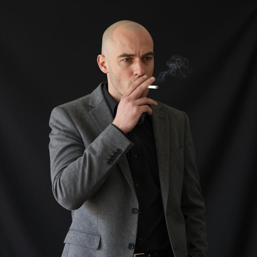 Bald man in gray suit, standing, right hand raised to mouth, holding cigarette, dark background, soft light from left, black cloth draped in background.