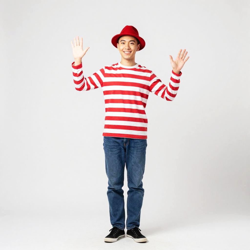 A young man dressed in a Waldo costume stands against a plain white background, wearing a classic red and white striped long-sleeve shirt, blue jeans, black sneakers, and a bright red hat. He poses with both hands raised and a cheerful smile, capturing a playful and iconic look. The image is well-lit with a clean, minimalist studio style.