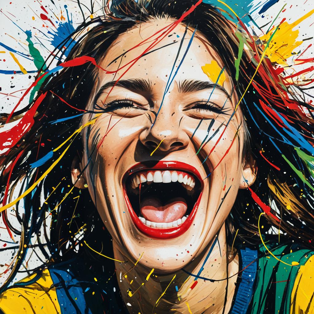 An abstract expressionist portrait of a joyful woman laughing exuberantly, created with chaotic scribble lines and vibrant splashes of red, blue, yellow, and green colors, energetic and bold brushstrokes conveying emotion and movement
