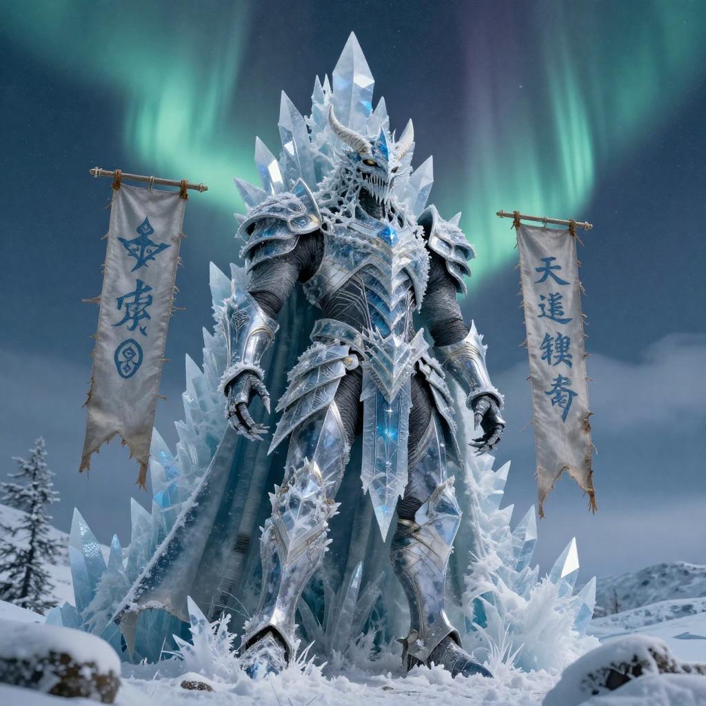 Frostbound leviathan rider — crystalline armor, frost runes, tattered banners perched in glacier spire crowned with aurora-lit ice crystals and swirling snow. Shot on Canon EOS C700 FF 5.9K with 50mm anamorphic lens, (hyperdetailed), 8K HDR, dramatic lighting, cinematic atmosphere.