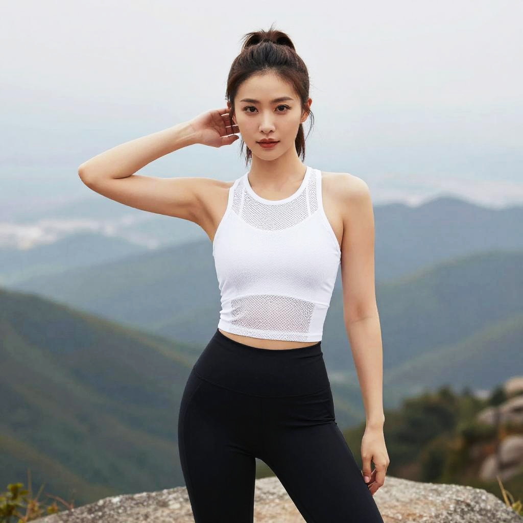 A woman in athletic sportswear, wearing a white mesh tank top and high-waist black yoga pants, enjoying a fitness bootcamp at a mountain summit, in a vibrant visual style. Sexy. Pretty face and beutiful eyes