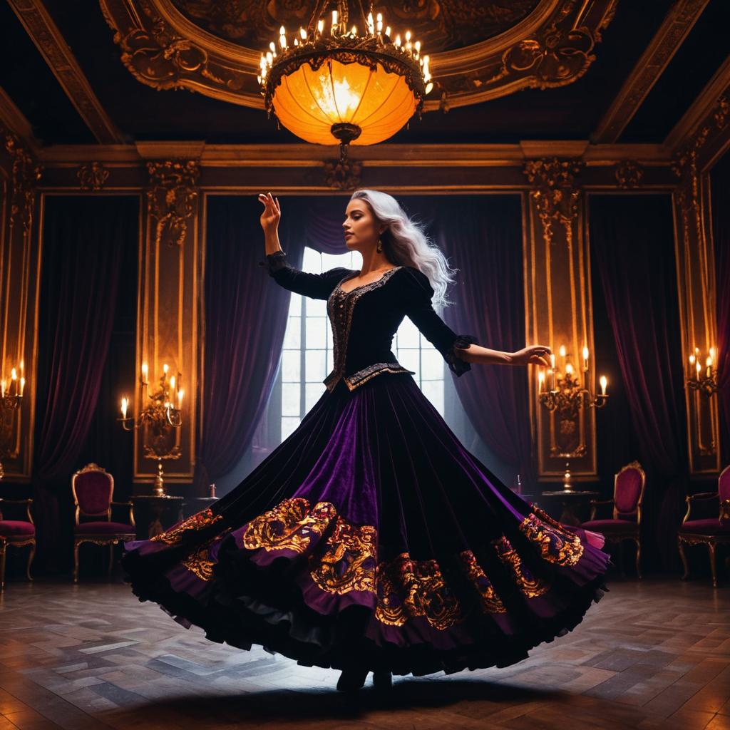 A large baroque ballroom with deep purple velvet curtains and glowing amber lanterns, a fierce woman with flowing silver hair dancing flamenco in the center, fiery and intense, cinematic lighting, ultra realistic, dark magic ambiance, 8k.