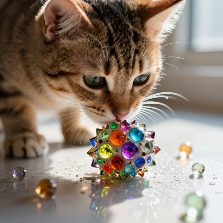 Close-up photograph of a curious tabby kitten with green eyes, intently sniffing a colorful, multi-faceted crystal ball toy on a reflective