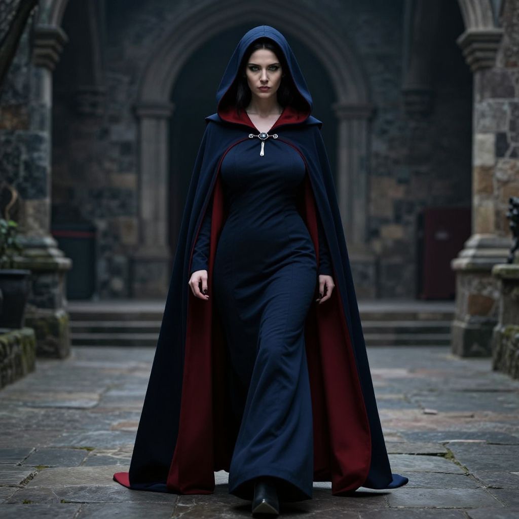 A mysterious woman with high cheekbones, a faintly glowing green iris, and a stern, calm expression walks through a dimly lit ancient castle courtyard, dressed in an oversized hooded cloak of midnight blue and crimson, the cloak's hem dragging slightly on the stone path. The silhouette is elegant yet ominous, blending fashion with a sense of secrecy and power.. The woman has big tits and cute face