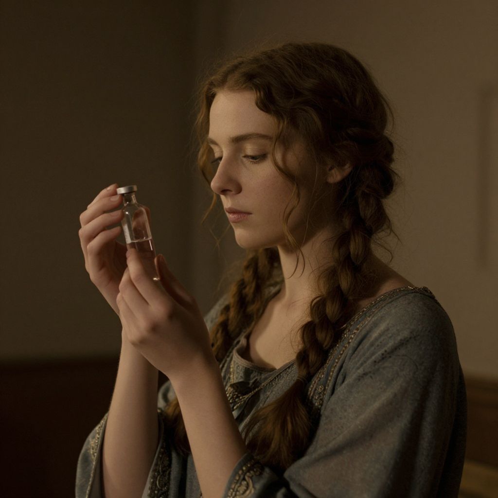 Photograph of a young Caucasian woman with fair skin and long, curly brown hair in two braids, wearing a loose, grey, long-sleeved dress with subtle gold embroidery. She is holding a small glass vial filled with a clear liquid, examining it closely with a focused expression. The background is dimly lit, with a plain, dark wall and a wooden baseboard, creating a moody, intimate atmosphere. The lighting is soft, highlighting her face and the vial, while her dress and background remain in shadow. The image has a cinematic quality, evoking a sense of mystery or historical period.