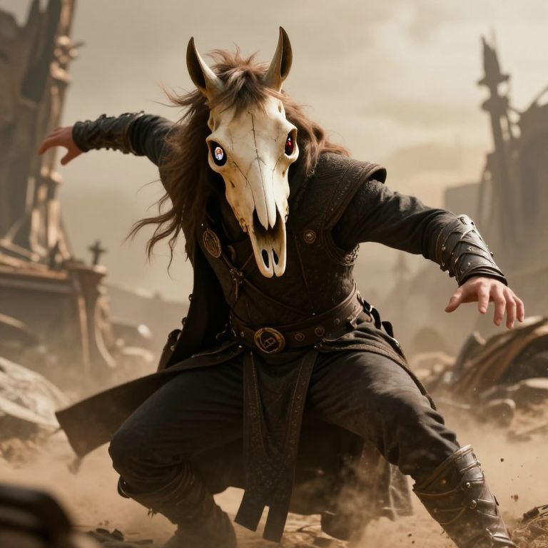 Photograph of a dark, ominous figure in a black, horned mask holding nine white, weathered skulls in a cluster. The figure's attire is adorned with spiked leather. The background is dimly lit with a purple and yellow gradient, casting shadows of two additional dark figures. The scene exudes a gothic, horror aesthetic with a focus on the skulls and the menacing, horned mask. The textures include the roughness of the skulls and the leather's spiky surface. The overall atmosphere is eerie and foreboding.