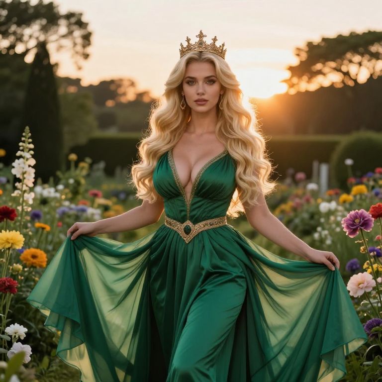 A digital artwork of a stunning blonde queen with long, wavy hair wearing a green, deep V-neck gown that showcases her large breasts. She's adorned with a gold crown and a matching belt. She stands in a lush garden at sunset, holding the sides of her flowing dress. The background is filled with blooming flowers and tall trees, with the sun setting behind her, casting a golden glow.
