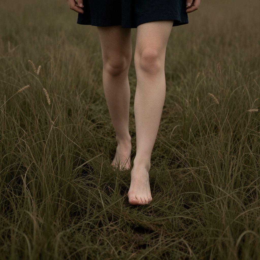 Photograph of a person's lower legs and feet walking barefoot through tall, brown grass. The individual is wearing a dark, knee-length skirt, revealing pale, slightly pinkish skin. The grass is dense and slightly overgrown, with some stalks bending underfoot. The image is cropped to focus on the legs and feet, with the background blurred, emphasizing the grass texture and the barefoot walk. The lighting is natural, suggesting an outdoor setting during an overcast day.
