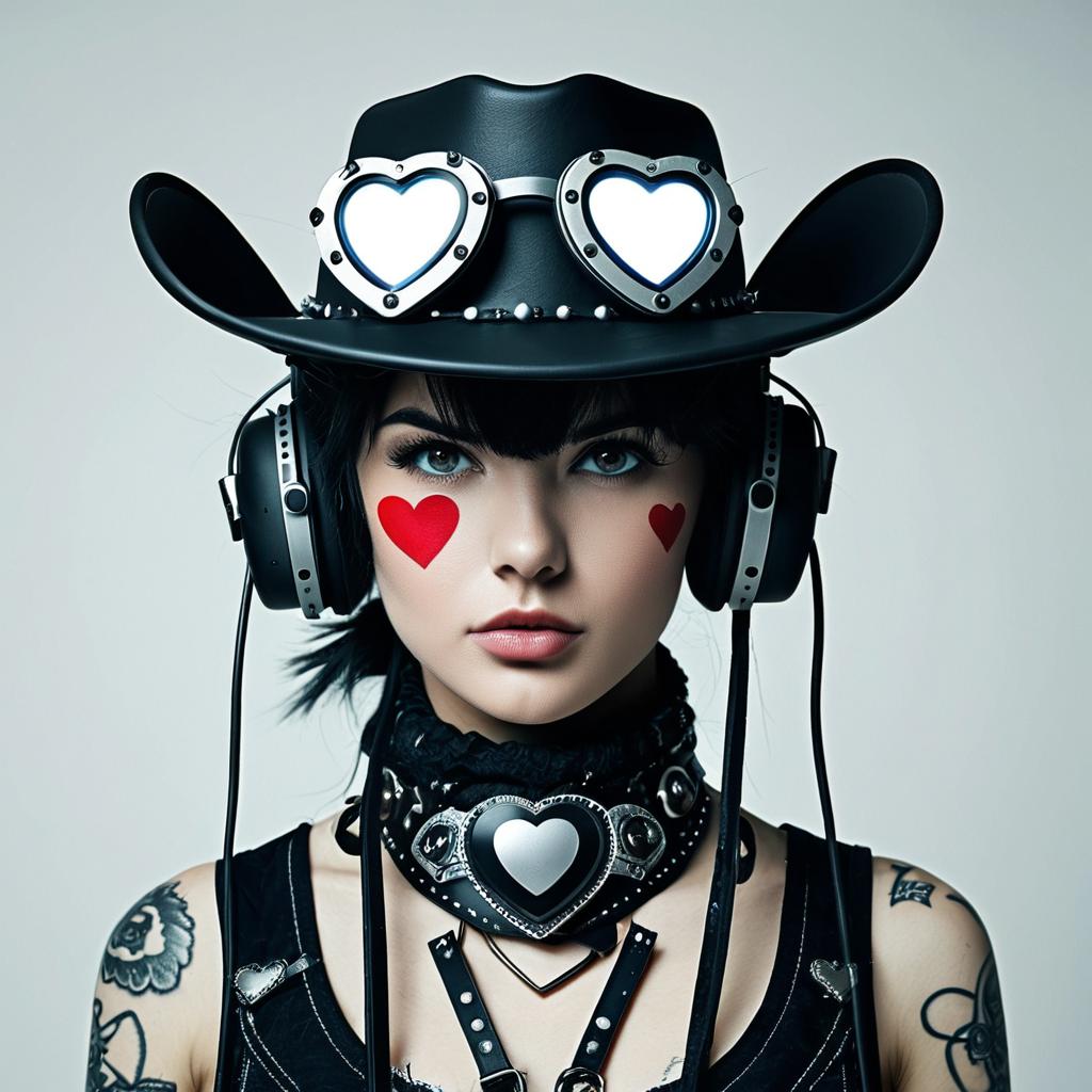 A digital photograph of a white woman with pale skin, black short hair, and blue eyes. She wears a black leather cowboy hat with heart-shaped white goggles, black headphones, and a black leather choker with a heart-shaped pendant. Red heart tattoos are on her cheeks. Her black leather tank top reveals tattoos on her arms. The background is a plain, light grey. The image has a high-contrast, cyber-gothic style with sharp, bold textures and a futuristic aesthetic.