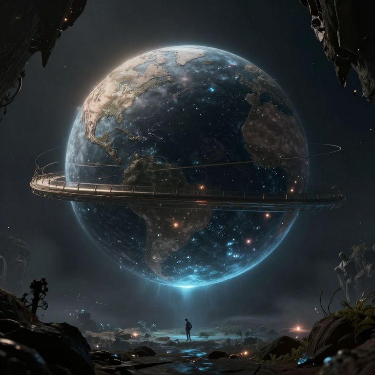 Digital artwork of a glowing, illuminated Earth with a futuristic ring-shaped structure orbiting it, set against a dark, starry background. Silhouet