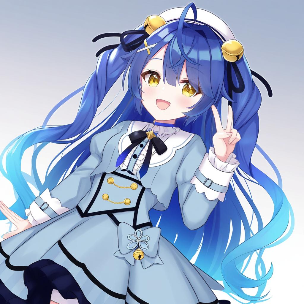 Digital illustration of an anime-style girl with very long blue twintails adorned with golden hair bells and black ribbons. She has yellow eyes, a small fang visible on her mouth, and an ahoge hairstyle feature. The girl is wearing a light blue and white detailed outfit with gold buttons, a black ribbon tie, and a school uniform-inspired design. She is posing with a peace sign and smiling.