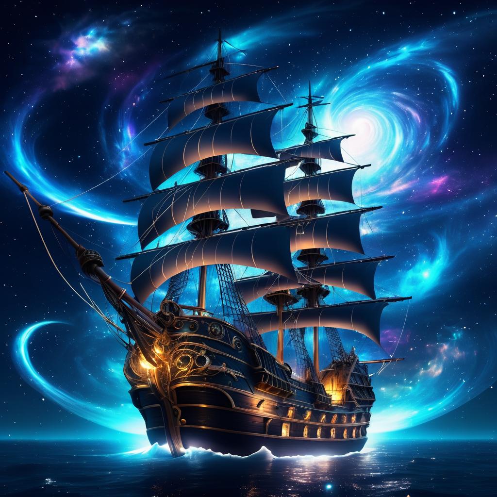 Pirate ship sailing through a celestial realm with swirling galaxies and glowing stars. Ultra-detailed concept art, trending on ArtStation, HD quality.