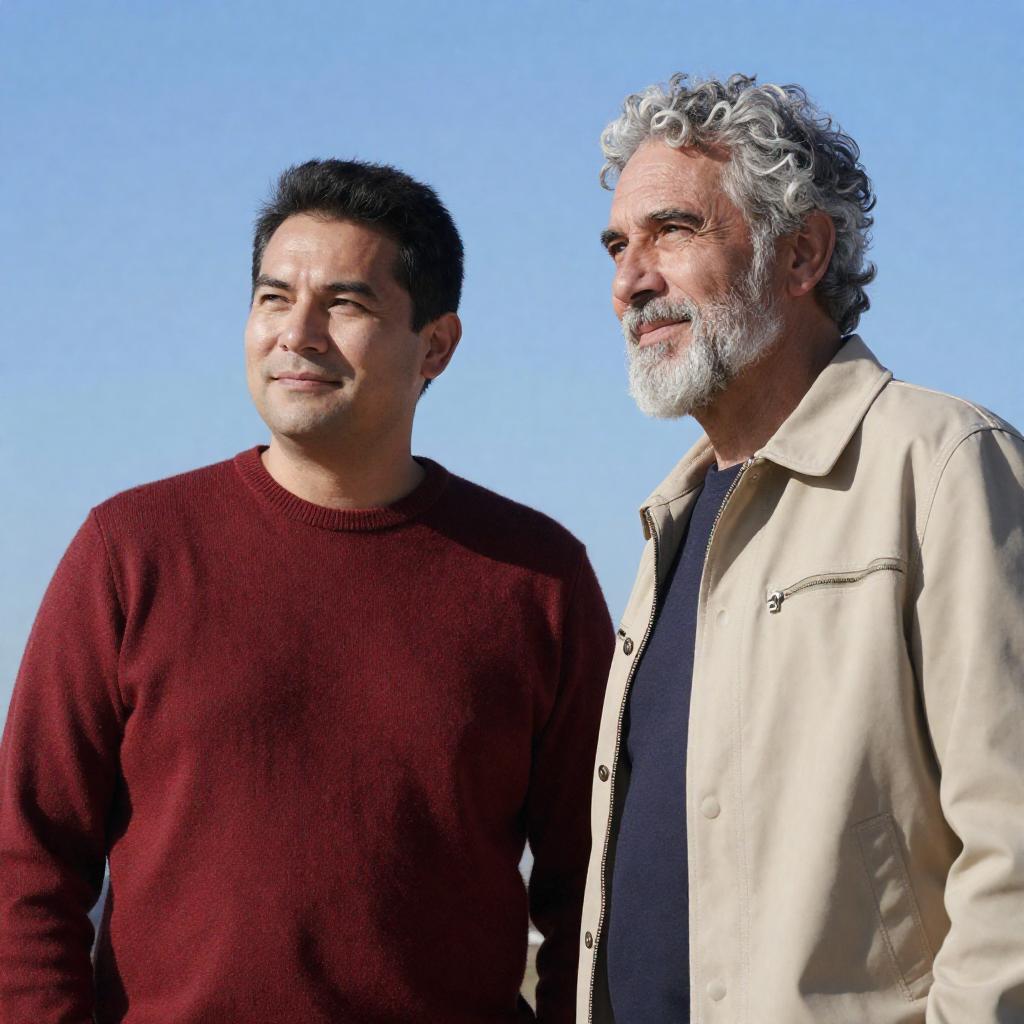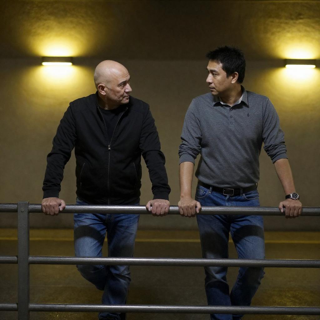 Photograph of two men in a dimly lit urban setting. One bald man in a black jacket and jeans leans on a metal railing, while a man with dark hair in a gray shirt and blue jeans stands beside him. Both hold metal bars, with yellow wall sconces illuminating the background.