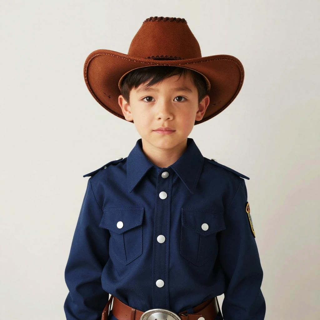 Photograph of a young Asian boy with straight black hair, wearing a dark blue denim sheriff's uniform with silver buttons and pockets, and a large brown cowboy hat. His expression is neutral, and he gazes directly at the camera. The white background is plain and unadorned, emphasizing the boy's attire and facial features. The image has a sharp focus and vibrant colors, highlighting the contrast between the blue uniform and the brown hat. The boy's skin is light, and he is positioned centrally in the frame.