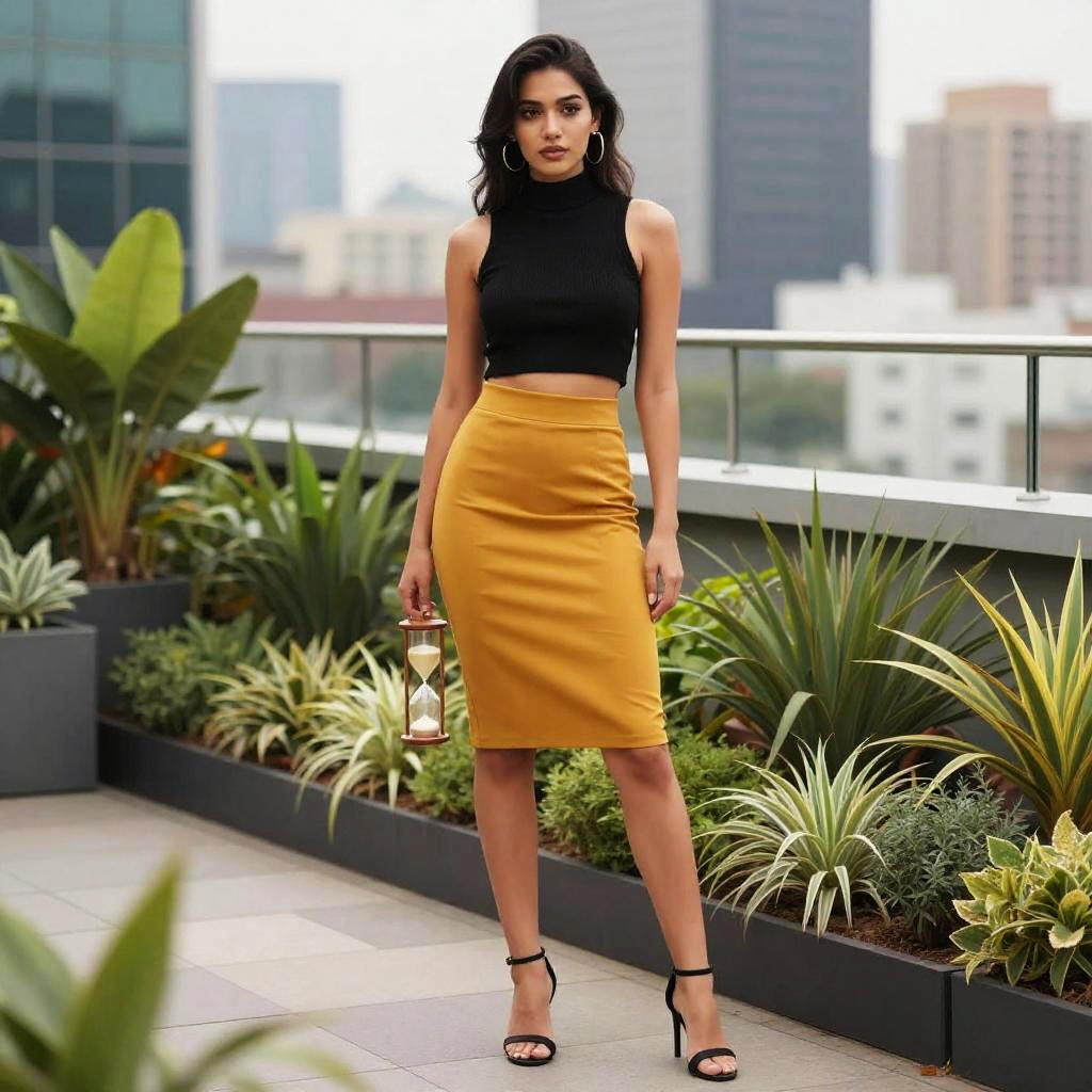 A hourglass woman in a modern chic black sleeveless turtleneck crop top and mustard pencil skirt stands in a vibrant city rooftop garden, surrounded by lush greenery and a stunning cityscape backdrop. She wears strappy black heeled sandals and large hoop earrings, embodying a tokyopop visual style. Sexy. Pretty face and beutiful eyes