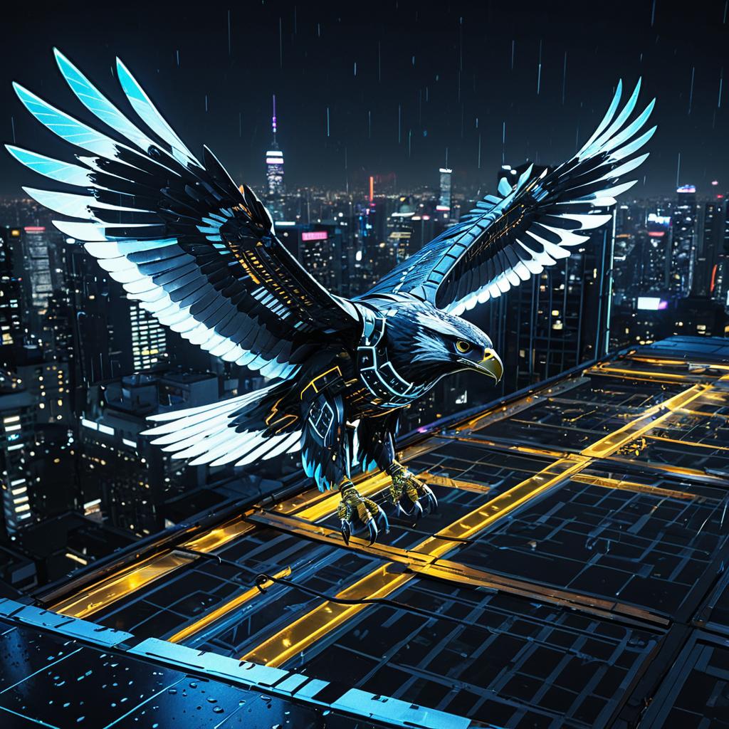 Photorealistic digital art of a high-tech cybernetic hawk with segmented titanium wings and glowing LED circuits, soaring above a neon-lit urban rooftop at night. The bird features a holographic retina displaying data metrics and is set against a rainy city skyline with reflective wet surfaces in 8K resolution.
