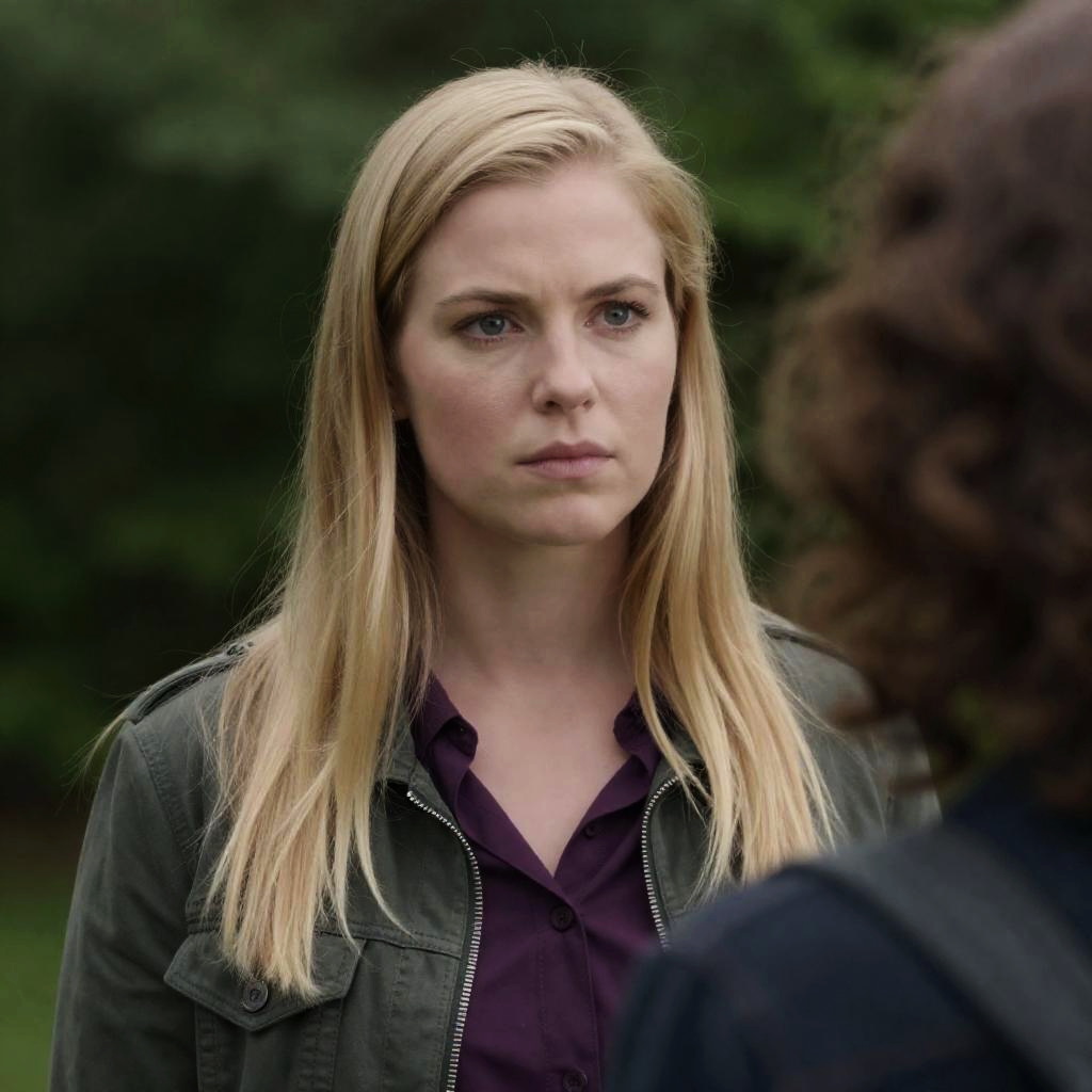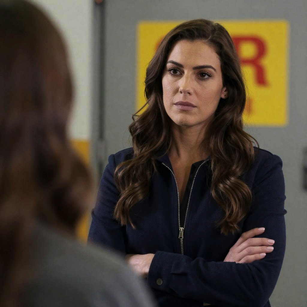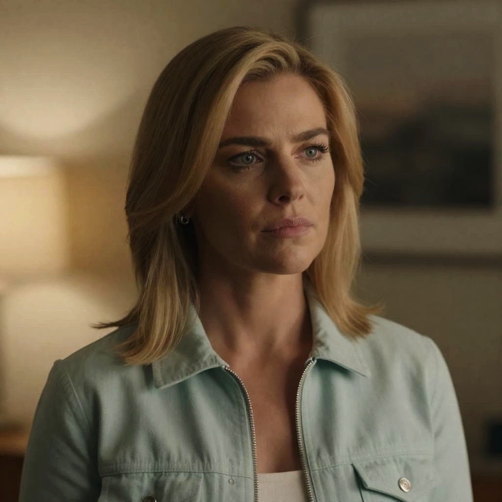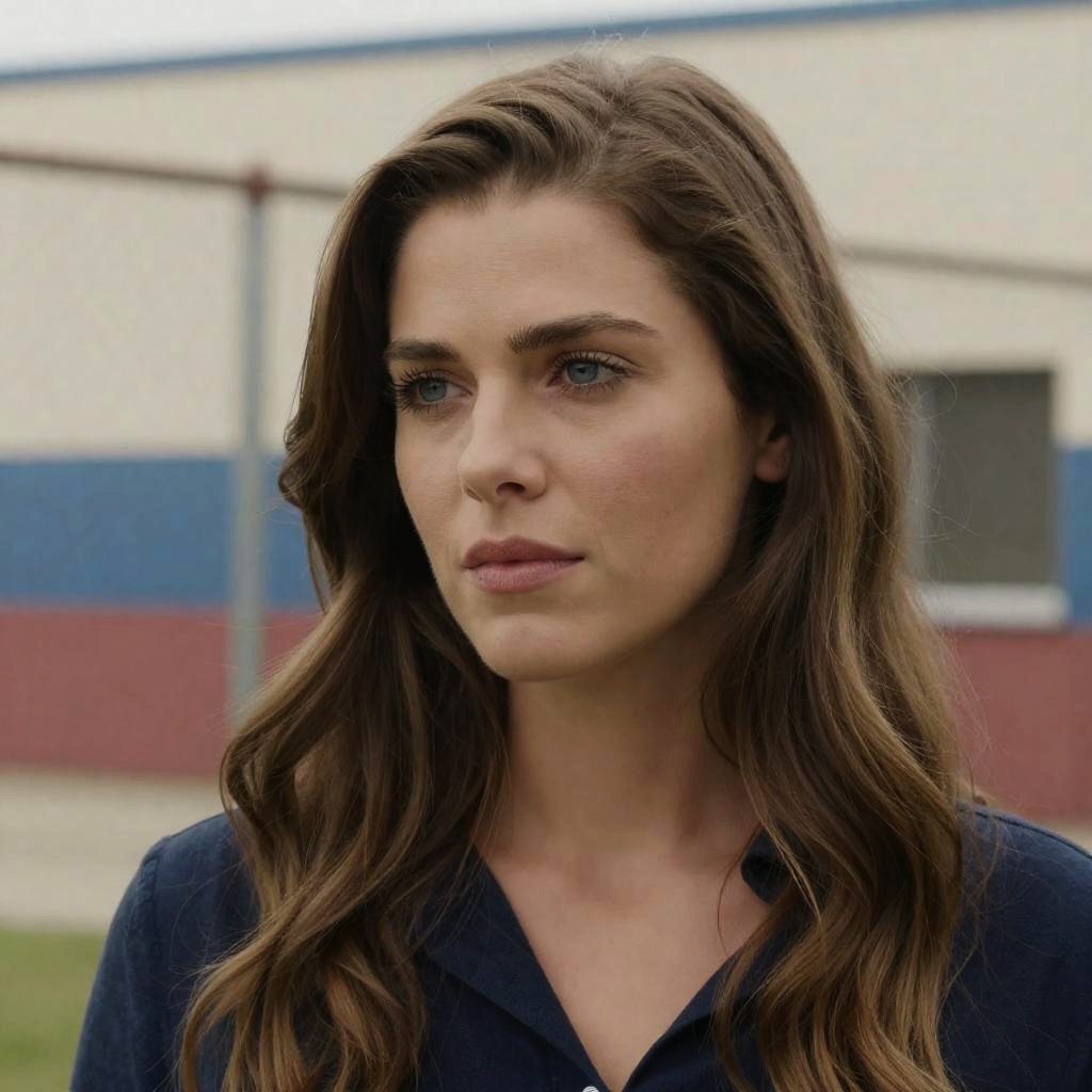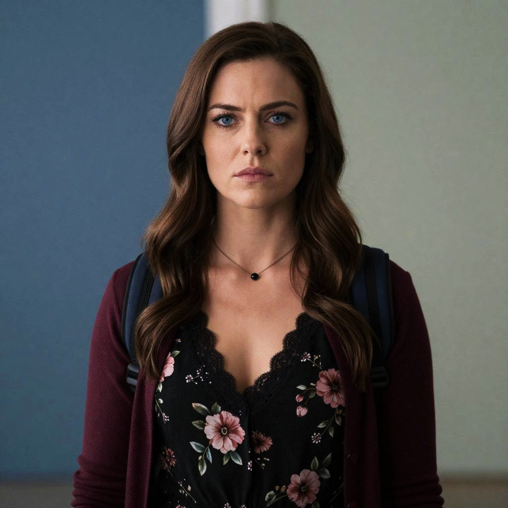 Photograph of a woman with long, wavy brown hair, blue eyes, and intense gaze. She wears a black floral dress with pink flowers, lace trim, and a maroon cardigan. She stands against a blurred blue and green background. She has a small black necklace and a serious expression. A backpack strap is visible on her right shoulder.