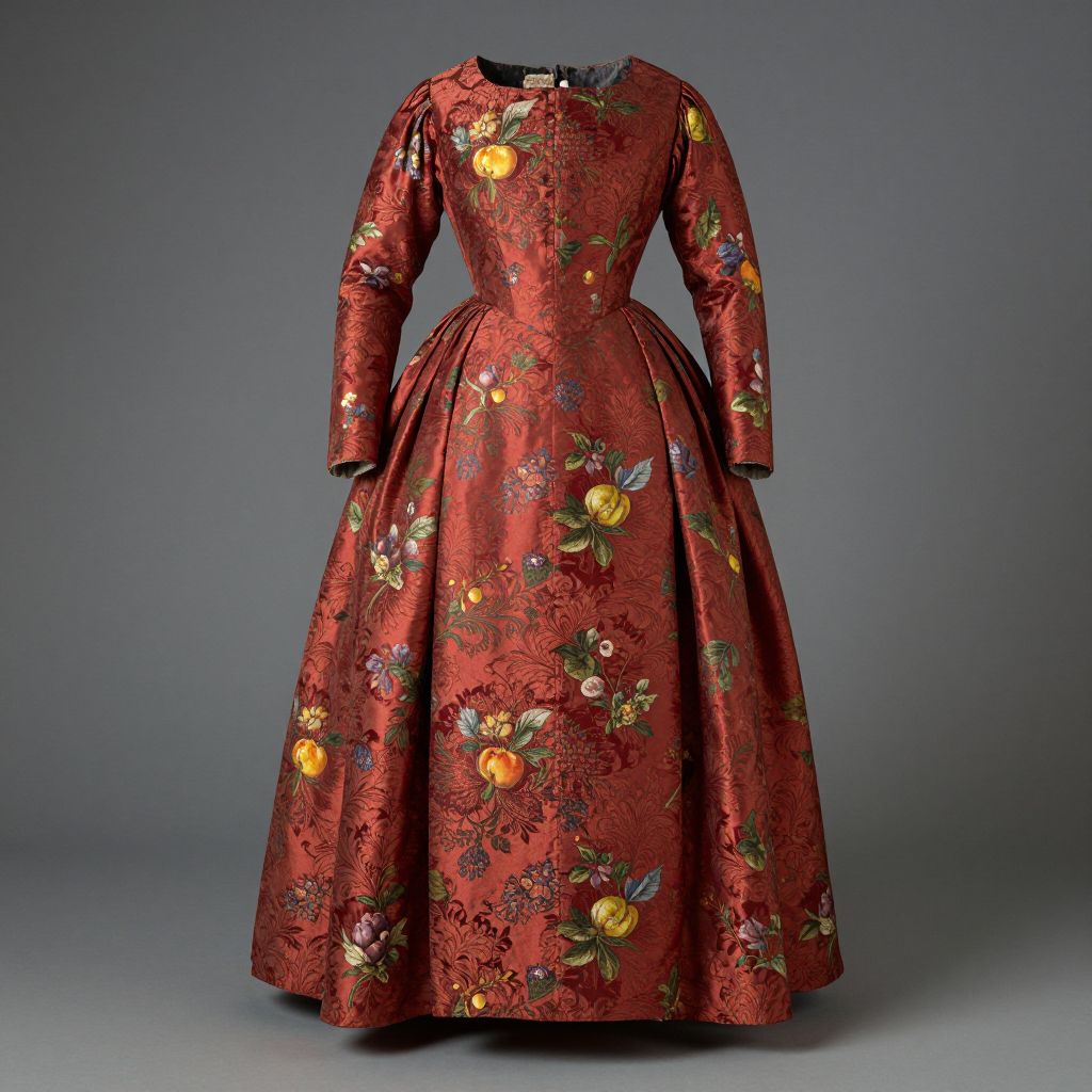 Ca. 1775 Robe a l'anglaise in red silk damask. The silhouette of this dress is enhanced by the fabric's rich color and vibrant pattern - a sumptuous display of fruit and flowers. The fabric was designed by Anna Maria Garthwaite, an English textile designer and the only woman known to have worked in Spitalfields, a silk-weaving center in London. | The Museum at FIT. Object Number: 2008.4.1
