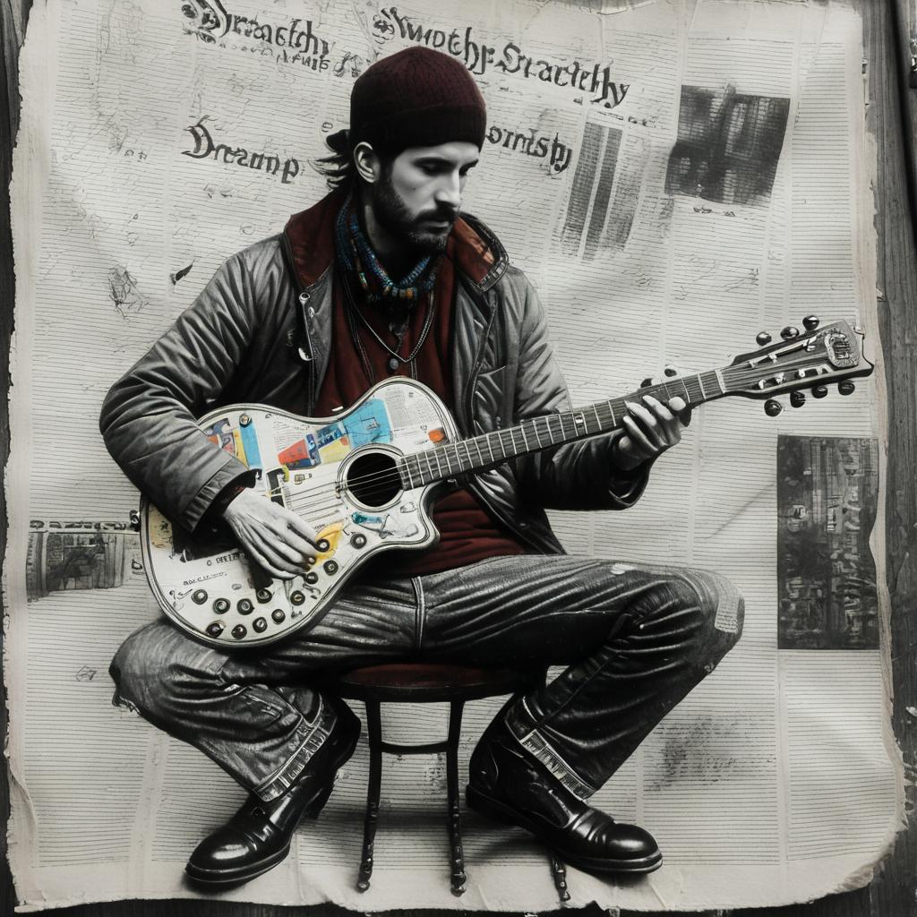 Mixed media artwork + (scratchy faded torn up newspaper overlay:2.0), vibrant street musician, wearing bohemian outfit, in the style of post-impressionism, grainy fuzzy distorted canvas effect, muted maroon, faded weathered effect color scheme, dreamlike atmosphere, abstract and distorted forms, distressed film grain.