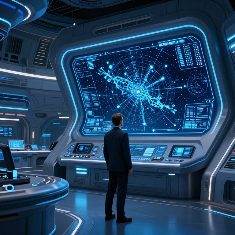 Sci-fi spaceship control room: Man in dark suit stands before glowing blue holographic star chart on futuristic console walls. Bright, high-tech ambiance. (