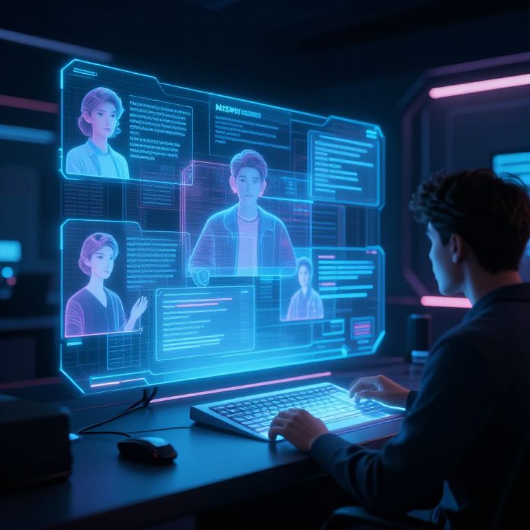 A photograph of a futuristic, neon-lit control room with a man seated at a desk, facing a large, holographic blue screen displaying four floating, semi-transparent 3D images of a woman and a man. The holograms include text overlays and data, with the man in the center hologram gesturing with his right hand. The man at the desk has curly hair and is wearing a dark jacket, typing on a glowing blue keyboard. The room is dimly lit, with neon pink and blue lights in the background, creating a high-tech, sci-fi atmosphere.