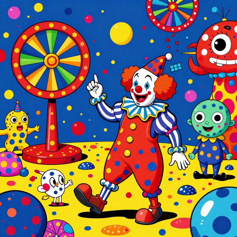 Vibrant cartoon circus scene: smiling clown with red polka-dot suit, colorful background, spinning wheel, colorful balloons, and whimsical creatures.