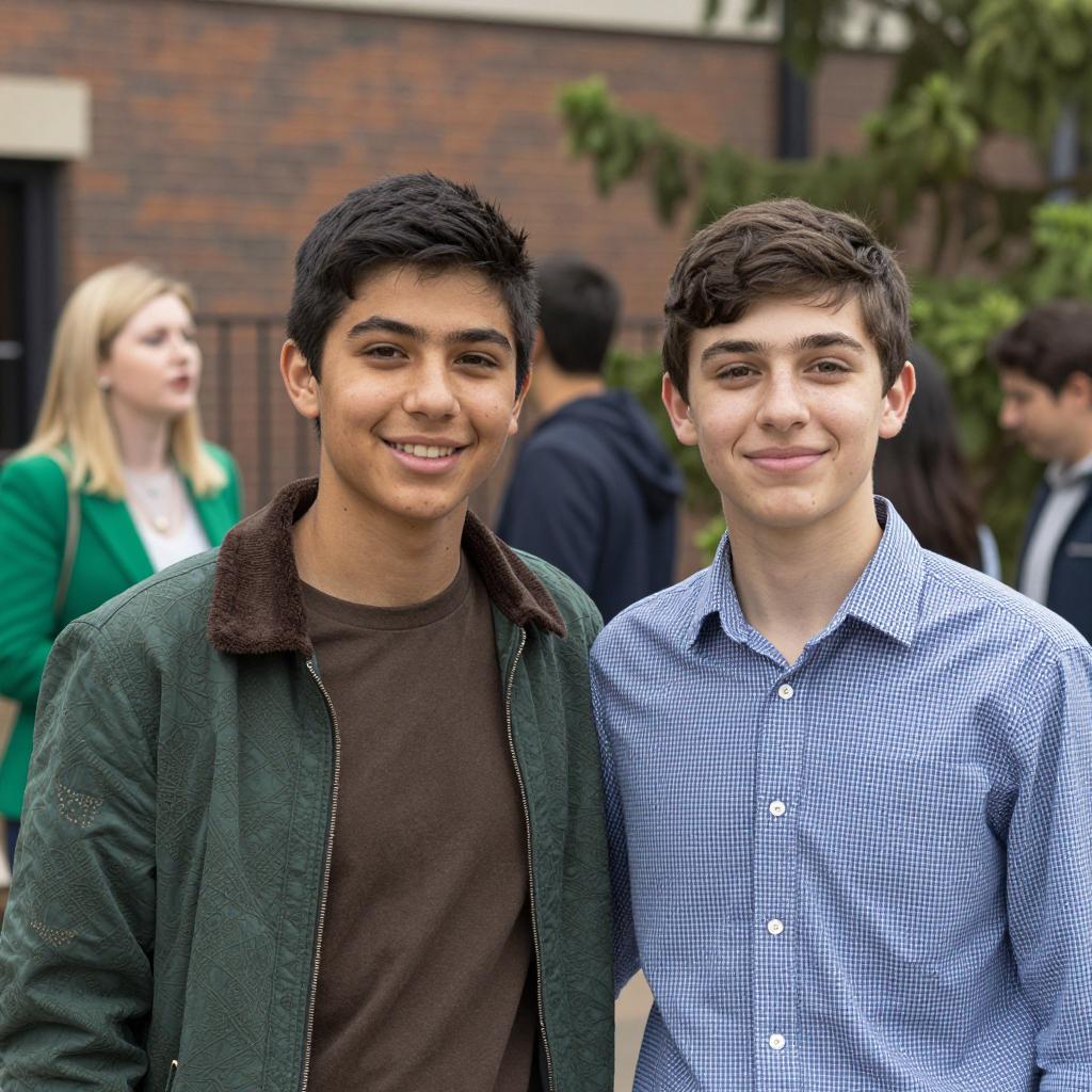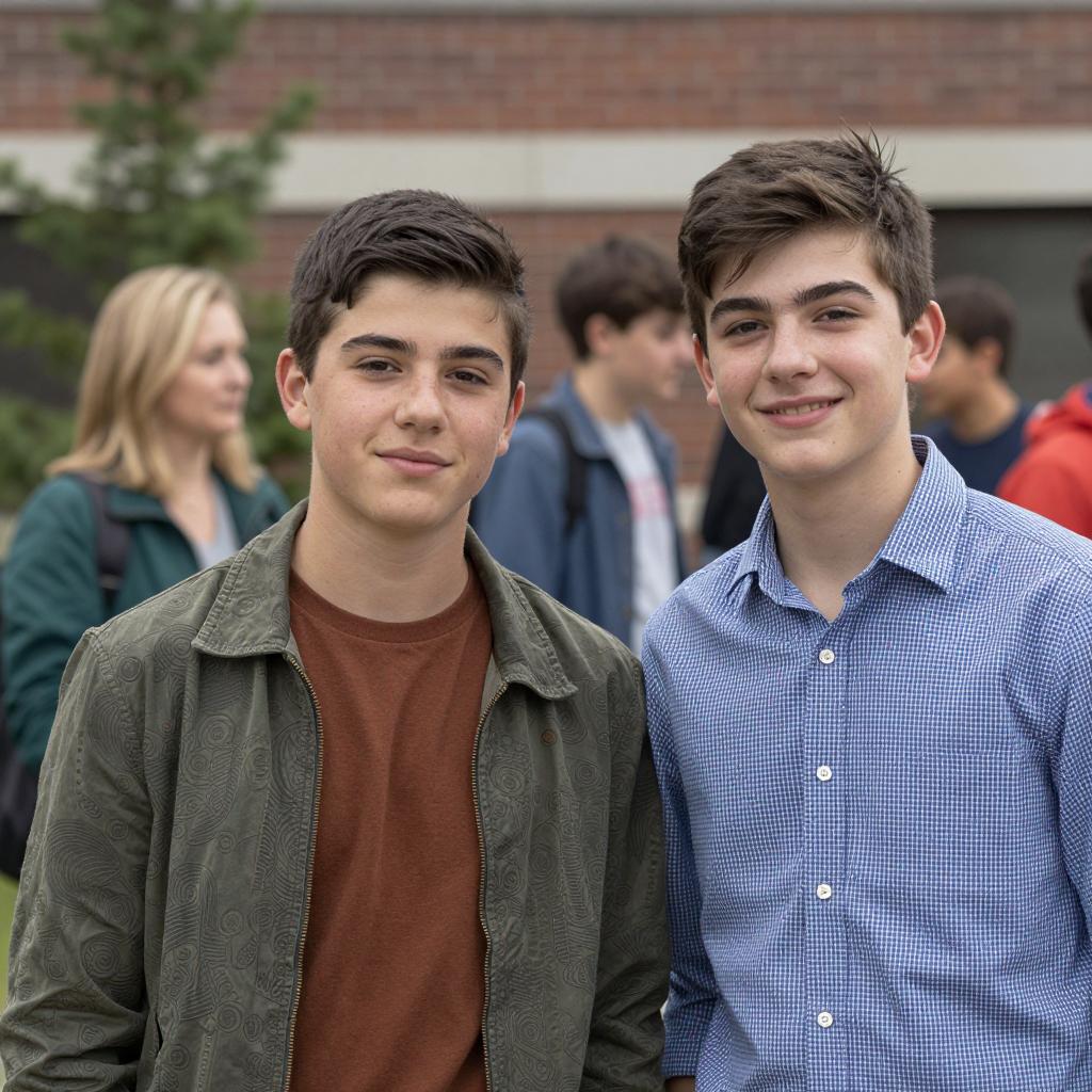 Portrait of two teenage boys standing indoors with a group of peers in the background. The boy on the left has dark brown hair, wearing a red jacket and gray shirt, smiling. The boy on the right has freckles, a black headband, and blue shirt with a black strap across his chest, looking directly at the camera. The background shows several other teenagers with neutral expressions in an indoor setting featuring wooden doors and a wall sign.