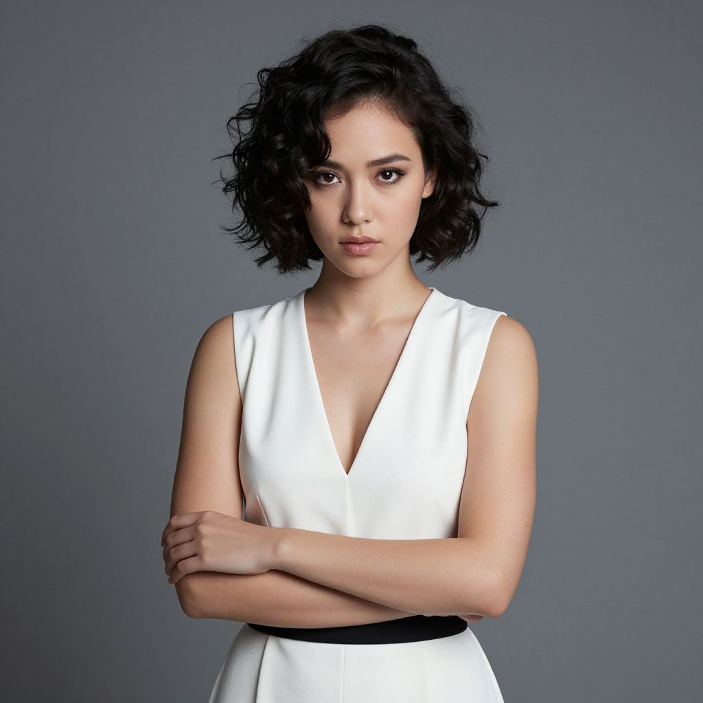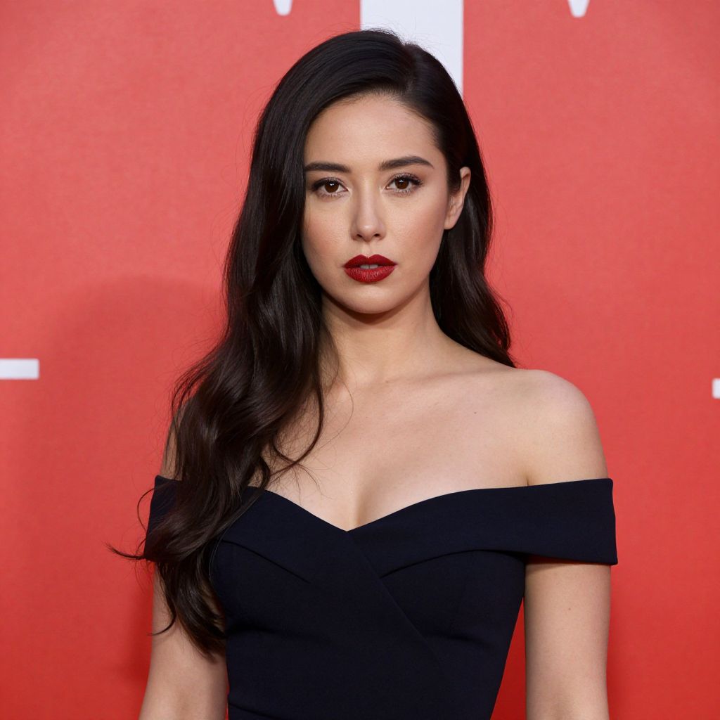 Intense gaze meets viewer as a woman with long, dark hair and bold red lipstick stands against a vibrant red backdrop, her off-the-shoulder dress accentuating her confident presence.