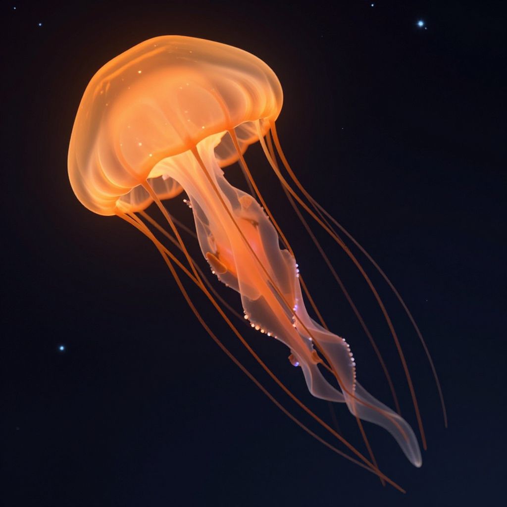 A mesmerizing 3D-rendered jellyfish glows with ethereal orange hues against a starry backdrop, its translucent tentacles elegantly cascading like celestial melodies in a high-definition digital artwork.