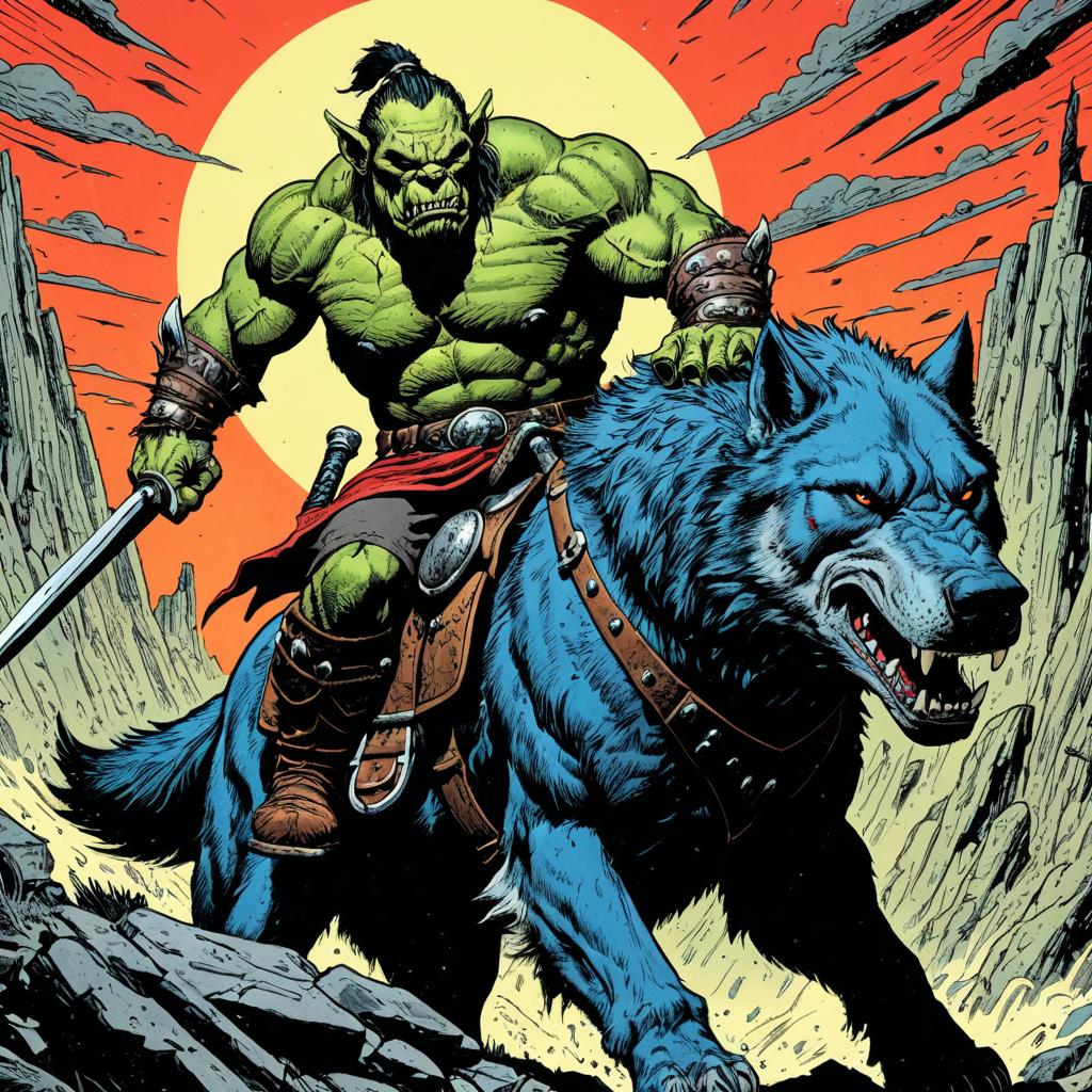 Highly detailed and vibrant illustration of a muscular green orc warrior wielding a sword, riding a fierce blue wolf in a fantasy landscape with rocky cliffs and an intense orange sun in the background. The artwork showcases sharp, precise linework with a heroic fantasy theme in the style of French comics, inspired by Heavy Metal, Richard Corben, and Moebius.