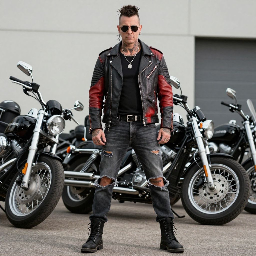 Photograph of a tattooed, spiked-haired man in black leather jacket with red sleeves, sunglasses, ripped jeans, and black boots, standing confidently in