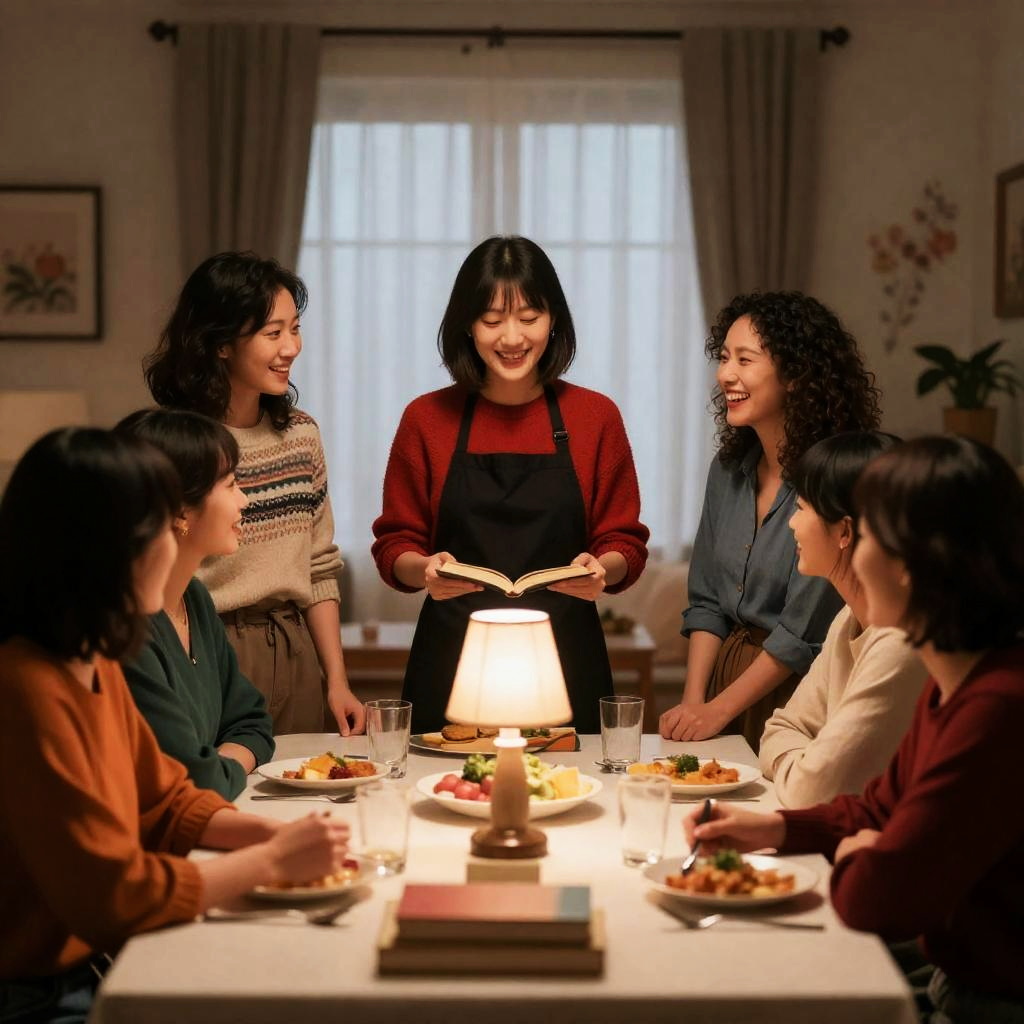 Photograph of six people around a table with many lit candles, in a dimly lit room with blue-curtained windows. Center: older man in red shirt, smiling. Others: varied ages, casual clothes, serious expressions. Table: plates, glasses, food, dishes. Background: wall sconces, statue, dark wood. Candlelight illuminates faces.