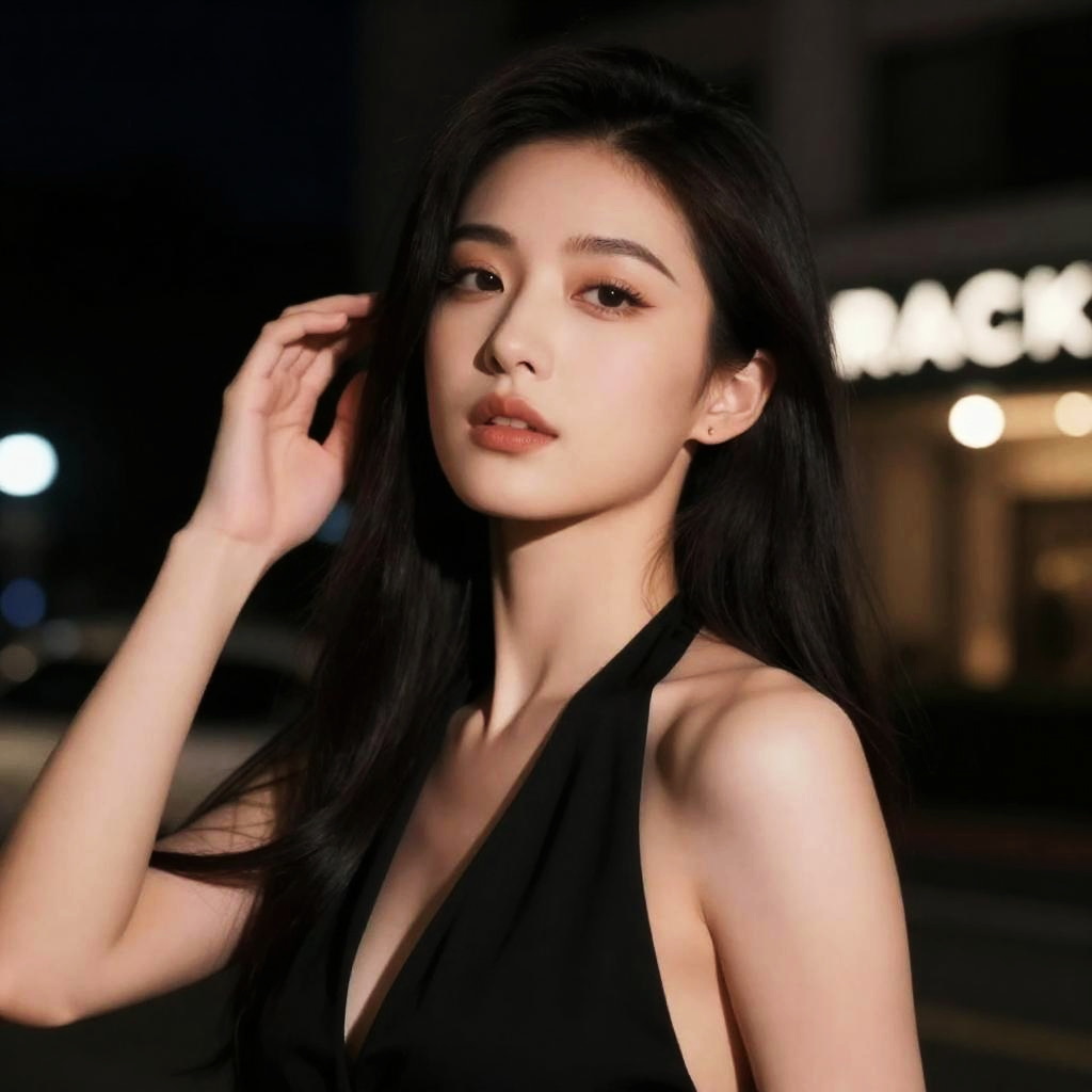 Woman posing for a photo, (wearing deep_v-neck_dress), (long_hime_cut_hairstyle:1.3), good hand, 4k, high-res, masterpiece, best quality, head:1.3, ((Hasselblad photography)), finely detailed skin, sharp focus, (cinematic lighting), night, soft lighting, dynamic angle, [:(detailed face:1.2):0.2], (((5 stars hotel)))