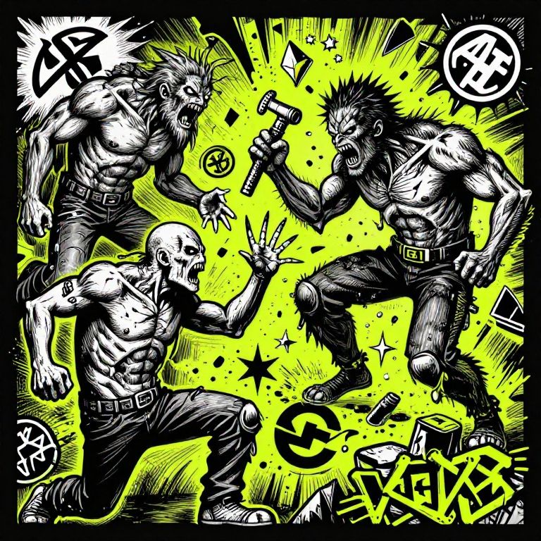 Grindcore art inspired by underground punk culture, showing a violent clash between monstrous figures and shattered symbols, using a mix of black and neon colors with intricate line work and explosive graffiti elements.
