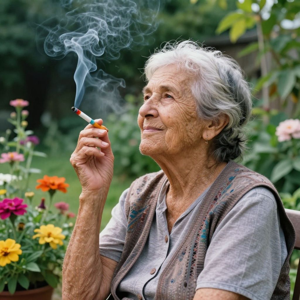 Joyful Granny Smoking in Vibrant Garden