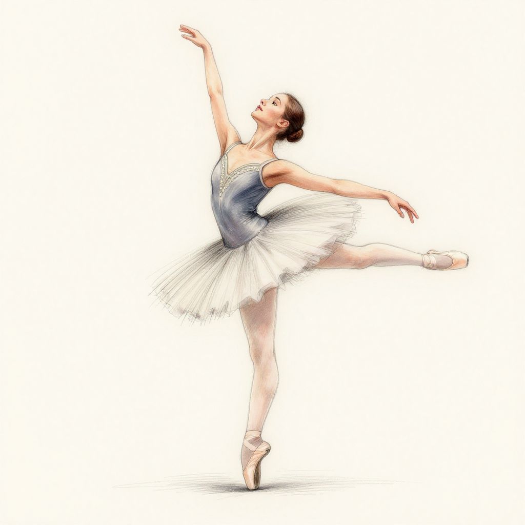 Inpaint sketch portraying an elegant ballerina mid-pose, delicate pencil strokes illustrating movement and form, enhanced with digital inpainting to bring soft pastel tones and gentle lighting, emphasizing grace and fluidity in the composition.